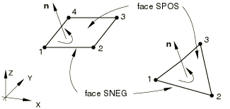 For all rigid elements the face on the side of the element with the positive outward normal is referred to as SPOS. The face on the opposite side is referred to as SNEG. The positive normal direction for each element is defined below.
