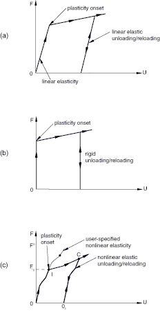 Linear elastic behavior, shown in Figure 31.2.6–1(a), is the most common case since similar behavior can be modeled in metal plasticity, for example, by specifying the Young's modulus. Elastic motion occurs prior to plasticity onset, and unloading from a plastic state occurs on a straight line parallel to the initial loading.
