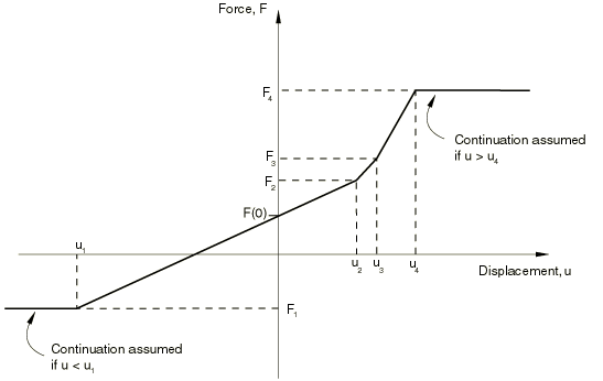 You define nonlinear spring behavior by giving pairs of force–relative displacement values. These values should be given in ascending order of relative displacement and should be provided over a sufficiently wide range of relative displacement values so that the behavior is defined correctly. Abaqus assumes that the force remains constant (which results in zero stiffness) outside the range given (see Figure 32.1.1–1).
