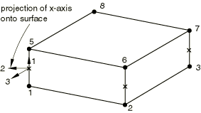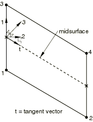 For three-dimensional line elements, the local 2-direction is obtained by the projection of the tangent to the midsurface of the element onto the plane orthogonal to the local 1-direction (see Figure 32.6.1–5). The local 3-direction is then obtained by the cross product of the local 1- and 2-directions.