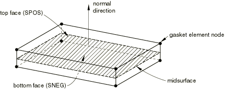 Figure 32.6.1–2 demonstrates the key geometrical features that are used to define gasket elements. Gasket elements are composed of two surfaces separated by a thickness. The relative motion of the bottom and top surfaces measured along the thickness direction to the gasket quantifies the thickness-direction (local 1-direction) behavior of the gasket element. The relative change in position of the bottom and top surfaces measured in the plane orthogonal to the thickness direction quantifies the transverse shear behavior of the gasket element. The stretching and shearing of the midsurface of the element (the surface halfway between the bottom and top surfaces) quantifies the membrane behavior of the gasket element.