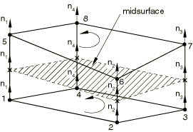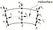 To compute the thickness direction for three-dimensional area elements, Abaqus/Standard forms a midsurface by averaging the coordinates of the node pairs forming the bottom and top surfaces of the element. This midsurface passes through the integration points of the element, as shown in Figure 32.6.4–3. Abaqus/Standard computes the thickness direction to the midsurface at each integration point; the positive direction is obtained with the right-hand rule going around the nodes of the element on the bottom or top surface. The thickness direction computed at each integration point is assigned to the nodes on either side of the integration point.