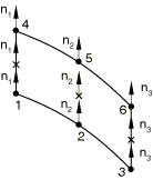 To compute the thickness direction for three-dimensional line elements, Abaqus/Standard computes the thickness direction at each integration point of the line element by differencing the coordinates of the element's surface nodes associated with the integration point. The thickness direction will point from the node on the bottom face to the node on the top face of the element. The thickness direction computed at each integration point is then assigned to the nodes on either side of the integration point (see Figure 32.6.4–4).