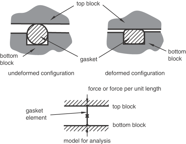 You can define the thickness-direction behavior in terms of force or force per unit length and closure only for link elements and three-dimensional line elements. This method is suited for cases where the gasket cross-section in the 1–2 or 1–3 plane varies greatly with deformation because it would be too expensive to model such a deformation with a full two- or three-dimensional model. In such cases a model with link elements or three-dimensional line elements can give meaningful answers as long as the deformation is quantified in terms of force or force per unit length (see Figure 32.6.6–1).