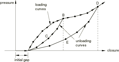 As the gasket is compressed, the pressure (or force, or force per unit length) follows the path given by the loading curve. If the gasket is unloaded, for example at point B, the pressure follows the unloading curveTo define the loading curve in piecewise linear form, you provide data points of pressure versus elastic closure, starting with point A. For negative elastic closures, the model gives zero pressure (or force). For closures larger than the last user-specified closure, the pressure-closure relationship is extrapolated based on the last slope computed from the user-specified data.