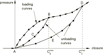 , and so on). You can specify as many unloading curves as are necessary. Each unloading curve always starts at point A, the point of zero pressure for zero elastic closure, since the damaged elasticity model does not allow any permanent deformation. If unloading occurs from a maximum closure for which an unloading curve is not specified, the unloading is interpolated from neighboring unloading curves. The unloading curves are stored in normalized form so that they intersect the loading curve at a unit stress (or unit force) for a unit elastic closure, and the interpolation occurs between these normalized curves. If unloading curves are not specified, the loading/unloading will follow the loading curve.