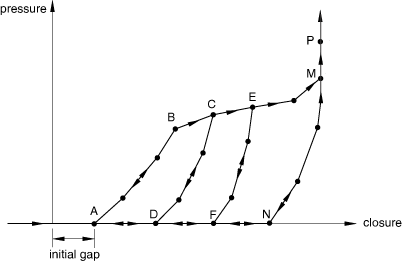 As the gasket is compressed, the pressure (or force) follows the path given by the loading curveAbaqus/Standard will automatically convert the curves so that the unloading curves become curves of pressure (or force) versus elastic closure for a given plastic closure. The loading curve will be transformed into an elastic loading/unloading curve defined at zero plastic closure (the portion