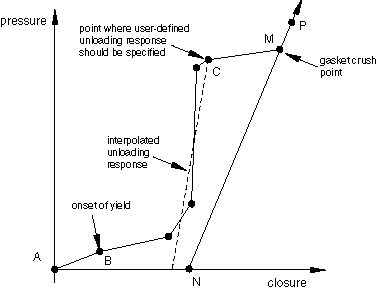 , and so on), you provide data points of pressure (or force, or force per unit length) versus closure (elastic plus plastic) for each given plastic closure (closure at points D, F, and so on) in ascending values of closure. You can specify as many unloading curves as are necessary. If unloading occurs at a plastic closure for which an unloading curve is not specified, the unloading curve is interpolated from neighboring unloading curves. If no unloading curves are specified, unloading is assumed to follow a curve similar to the initial nonlinear elastic segment of the loading curve. The unloading curves are stored in normalized form so that they intersect the yield curve at a unit stress (or unit force) for a unit elastic closure, and the interpolation occurs between these normalized curves.