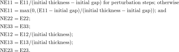 If user subroutine UEXPAN is used to define the thermal expansion of the gasket, the incremental thermal strains must be provided in the subroutine. The thermal closure will be obtained from the thermal strain in the thickness direction, as described above.