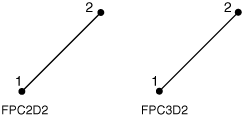 Both available fluid pipe connector elements (FPC2D2 and FPC3D2) are defined by two nodes, which can be coincident. If the nodes are not coincident, the length of the fluid pipe connector element is ignored in the viscous loss computations. You must associate the fluid pipe connector section with a set of fluid pipe connector elements.