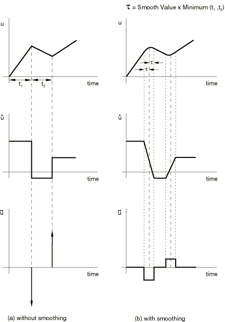 When the velocity time history is defined by a piecewise linear amplitude variation, the corresponding acceleration is piecewise constant. Smoothing can be used to modify the piecewise linear velocity variation into a combination of piecewise linear and piecewise quadratic variations. Smoothing ensures that the acceleration varies continuously during the time period of the amplitude definition.