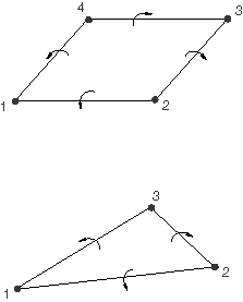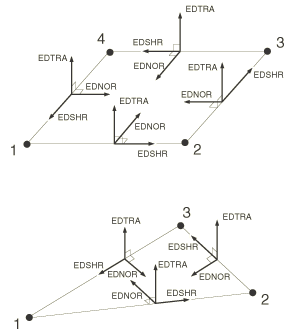 An edge moment acts about the shell edge with the positive direction determined by the element connectivity. The directions of positive edge moments are shown in Figure 34.4.3–7.