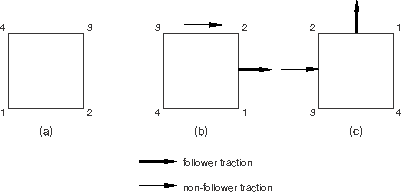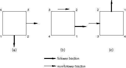 Follower loads are discussed further in “Follower surface loads” and “Follower edge and line loads.” The contribution of follower loads to load stiffness is discussed in “Improving the rate of convergence in large-displacement implicit analysis.”