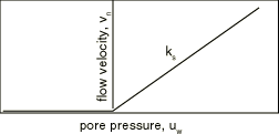 Figure 34.4.7–1 illustrates this pore pressure–velocity relationship. This surface condition is designed for use with the total pore pressure formulation (see “Coupled pore fluid diffusion and stress analysis,” Section 6.8.1), mainly for cases where the phreatic surface intersects an exterior surface that is free to drain. See “Calculation of phreatic surface in an earth dam,” Section 10.1.2 of the Abaqus Example Problems Guide, for an example of this type of calculation.