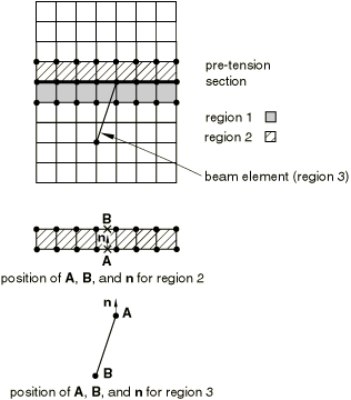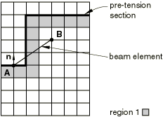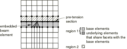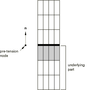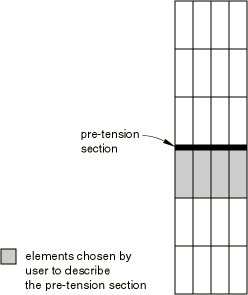 If the pre-tension section has an odd shape and one or more line elements that cross over element boundaries are connected to it, consult the list of the underlying elements given in the data (.dat) file to make sure that the underlying elements are listed correctly.Elements that are connected only to the nodes on the pre-tension section, including single-node elements (such as SPRING1, DASHPOT1, and MASS elements) are not included as underlying elements: they are considered to be attached to the other side of the section.