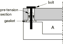 Container A is sealed by pre-tensioning the bolts that hold the lid, which places the gasket under pressure. This pre-tensioning is simulated in Abaqus/Standard by adding a “cutting surface,” or pre-tension section, in the bolt, as shown in Figure 34.5.1–1, and subjecting it to a tensile load. By modifying the elements on one side of the surface, Abaqus/Standard can automatically adjust the length of the bolt at the pre-tension section to achieve the prescribed amount of pre-tension. In later steps further length changes can be prevented so that the bolt acts as a standard, deformable component responding to other loadings on the assembly.