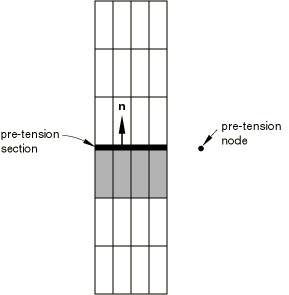 The assembly load is transmitted across the pre-tension section by means of the pre-tension node. The pre-tension node should not be attached to any element in the model. It has only one degree of freedom (degree of freedom 1), which represents the relative displacement at the two sides of the cut in the direction of the normal (see Figure 34.5.1–3). The coordinates of this node are not important.