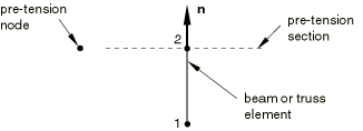 When a pre-tensioned component is modeled with truss or beam elements, the pre-tension section is reduced to a point. The section is assumed to be located at the last node of the element as defined by the element connectivity (see “Beam element library,” Section 29.3.8, and “Truss element library,” Section 29.2.2, for a definition of the node ordering for beam and truss elements, respectively), with its normal along the element directed from the first to the last node. As a result, the section is defined entirely by just specifying the element to which an assembly load must be prescribed and associating it with a pre-tension node.