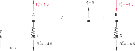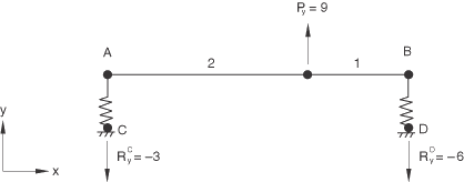 To illustrate this behavior, consider a spring-supported beam subjected to a concentrated load as shown in Figure 35.2.1–1. The static reaction forces are and . In Figure 35.2.1–2 the same structure is subjected to the additional linear constraint equation , which constrains the beam to remain horizontal. This introduces constraint forces and , and the new reaction forces are . These reaction forces produce a global force balance in the Y-direction, but since the constraint forces are not included in reaction force output, the global moment balance about point A cannot be verified.