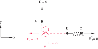 The global force balance can also be incomplete. This is demonstrated in Figure 35.2.1–3, where a pulley connection between nodes A and B is represented by the linear constraint equation . The constraint forces at the pulley, and , are not included in the reaction force output, producing incomplete global force balances in both the X- and Y-directions.