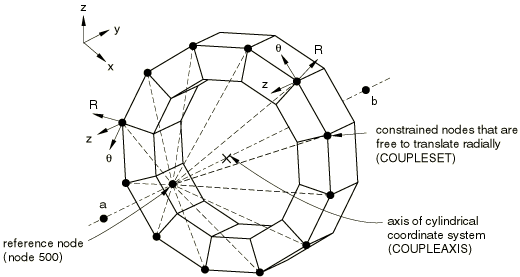 The constrained degrees of freedom at the coupling nodes can be specified in a local coordinate system instead of the (default) global coordinate system (see “Orientations,” Section 2.2.5). Figure 35.2.3–1 illustrates the use of a local coordinate system definition with a kinematic coupling constraint to constrain all but the radial translation of a group of nodes to a reference node. In this example a local cylindrical coordinate system is defined that has its axis coincident with the structure's axis. The coupling node constraints are then specified in this local coordinate system. In this example the constrained nodes are attached to continuum elements; thus, only translational degrees of freedom need to be specified.