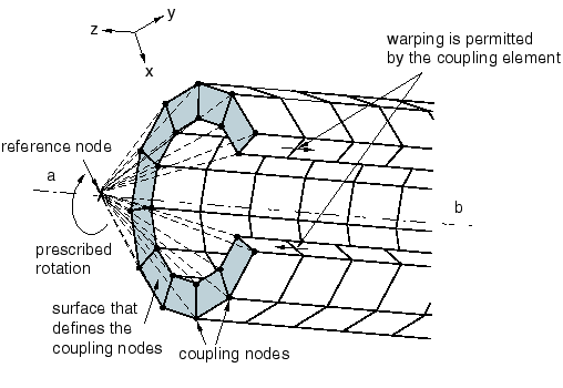In this example the moment constraint between the reference node and the coupling nodes will be released in the 6-direction but will be enforced in the 4- and 5-directions. This provides a “revolute-like” rotation connection between the reference node and the coupling nodes (see General multi-point constraints, Section 35.2.2).