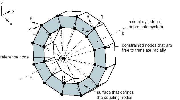 The kinematic coupling constraint can be specified with respect to a local coordinate system instead of the global coordinate system (see Orientations, Section 2.2.5). Figure 35.3.2–1 illustrates the use of a local coordinate system to constrain all but the radial translation degrees of freedom of the coupling nodes to the reference node. In this example a local cylindrical coordinate system is defined that has its axis coincident with the structure's axis. The coupling node constraints are then specified in this local coordinate system.