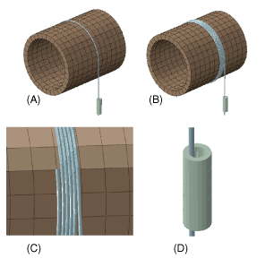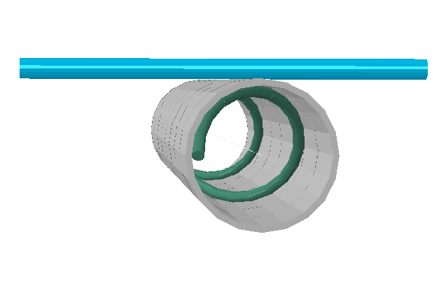 The edge-to-edge contact formulation with a radial normal can involve the “exterior” of beam, shell, and solid feature edges and the “interior” of hollow beams, as shown in the example in Figure 36.2.1–6. This example involves a wire modeled with beam elements being wound onto a cylinder modeled with solid elements. The wire passes through a hollow cylindrical guide before coming onto the cylinder. The “radial” edge-to-edge formulation resolves contact between adjacent coils of the wire and also resolves contact between the wire and the interior of the hollow beam representing the guide. The edge-to-surface contact formulation resolves contact between the wire and the cylinder.