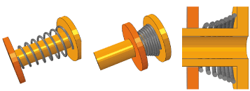 The example shown in Figure 36.2.1–5 involves compression of a spring modeled with beam elements. This example relies on the edge-to-edge contact formulation with a radial normal direction to resolve contact between adjacent spring coils, and it relies on the edge-to-surface contact formulation to resolve contact between the spring and other surfaces.