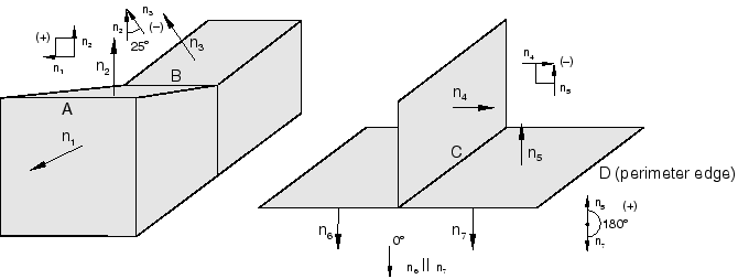 The feature angle is the angle formed between normals of two facets connected to an edge. The angles between facets are based on the initial configuration. A negative angle results at concave meetings of facets; therefore, these edges are never included in the contact domain. Figure 36.2.2–1 shows some examples of how the feature angle is calculated for different edges.