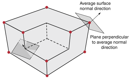 Abaqus/Standard computes an average surface normal direction for the node and an associated plane that passes through the node and is perpendicular to this direction. Two examples of such normal directions and planes are shown in Figure 36.2.2–4.