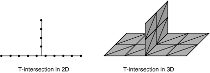 | Discontinuous (or 3D faces joined at only one node) | T-intersection | |
