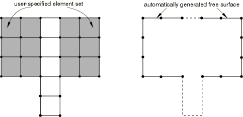Discontinuous surfaces: Discontinuous contact surfaces are allowed in many cases, but the master surface for finite-sliding, node-to-surface contact cannot be made up of two or more disconnected regions (they must be continuous across element edges in three-dimensional models or across nodes in two-dimensional models). Figure 36.3.1–2 shows examples of continuous surfaces, whereas Figure 36.3.1–3 and Figure 36.3.1–4 show examples of discontinuous surfaces. Figure 36.3.1–5 shows an automatically generated free surface resulting from the specification of an element set consisting of two disjointed groups of elements. The resulting surface is not continuous since it is composed of two disjoint open curves, so this surface would be invalid as a master surface for finite-sliding, node-to-surface contact.