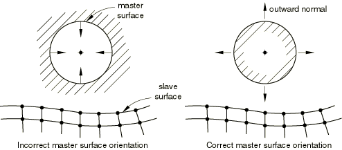Except for initial interference fit problems (see “Modeling contact interference fits in Abaqus/Standard,” Section 36.3.4), the slave surface should be on the same side of the master surface as the outward normal. If, in the initial configuration, the slave surface is on the opposite side of the master surface as the outward normal, Abaqus/Standard will detect overclosure of the surfaces and may have difficulty finding an initial solution if the overclosure is severe. An improper specification of the outward normal will often cause an analysis to immediately fail to converge. Figure 36.3.1–1 illustrates the proper and improper specification of a master surface's outward normal.