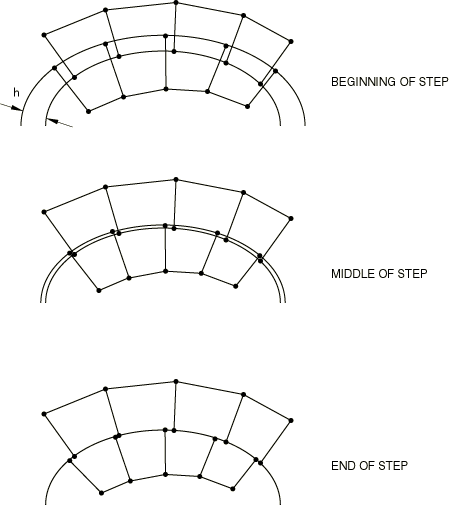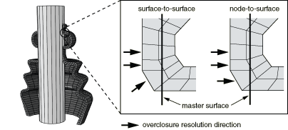 Large interferences may be difficult to resolve with the finite-sliding, surface-to-surface formulation. Using this formulation, overclosures tend to be resolved along the slave facet normal directions; using node-to-surface contact, overclosures tend to be resolved along the master surface normal directions. Figure 36.3.4–3 illustrates a case where differing normal directions lead to undesirable tangential motion during an interference fit. In some cases it may be preferable to resolve large initial overclosures with node-to-surface discretization.