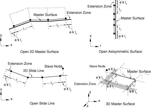 To prevent slave nodes from “falling off” or getting trapped behind a master surface, an open surface or slide line can be extended beyond its perimeter edges (in three dimensions) or end nodes (in two dimensions) for finite-sliding, node-to-surface contact.