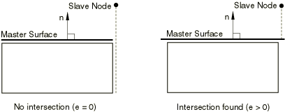 Figure 36.3.8–1 Slave node fails to find an intersection with the master surface for small-sliding, node-to-surface contact if e=0.