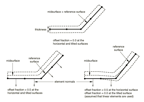 A surface offset is the distance between the midplane of a thin body and its reference plane (defined by the nodal coordinates and element connectivities). It is computed by multiplying the offset fraction (specified as a fraction of the surface thickness) by the surface thickness and the element facet normal. This defines the position of the midsurface and, thus, the position of the body with respect to the reference surface; the coordinates of the nodes on the reference surface are not modified. Surface offsets can be specified only for surfaces defined on shell and similar elements (i.e., membrane, rigid, and surface elements). Surface offsets specified for other elements (e.g., solid or beam elements) will be ignored. By default, surface offsets specified in element section definitions will be used in the general contact algorithm.