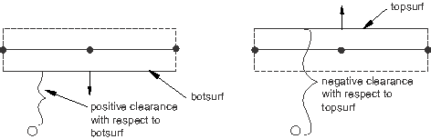 The surfaces specified must be single-sided and cannot contain complex intersections of faces (i.e., an edge cannot be connected to more than two faces) or discontinuous normals. Surfaces defined on solid elements will satisfy these requirements automatically. These restrictions arise from the definition of a clearance for surfaces on double-sided elements: a node has a positive (negative) clearance with respect to a surface if it is above (below) the surface as defined by the surface normal (see Figure 36.4.4–2). A negative clearance of a node with respect to a surface on double-sided elements does not indicate a state of penetration, but rather that the node has a gap with the other side of the elements underlying the surface.