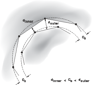 In cases where the geometry of the mesh is important or if nodal adjustments conflict, contact offsets should be created. Conflicting nodal adjustments are a common problem when specifying clearances via nodal adjustment for curved surfaces with a balanced master-slave interaction. Adjustments of nodes tend to change the curvature of curved surfaces because the clearance “constraint” can be satisfied only if the surface meshes are coincident (and a zero clearance is specified) or if the surfaces are flat (see Figure 36.4.4–6).