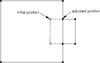 The resulting adjustment is shown in Figure 36.4.4–4. Adjusting the nodal coordinates may degrade the mesh geometry by creating imperfections that were not initially present, may reduce the element size and correspondingly the stable time increment size, or may cause elements to invert and prevent the analysis from continuing. In such cases it is preferable to bypass the nodal coordinate adjustments and specify the storage of a contact offset.