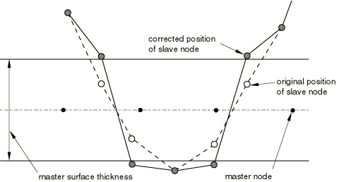 Slave nodes that are trapped on opposite sides of a double-sided master surface will often lead to serious problems, which may not become apparent until later in the analysis. Surfaces that are initially crossed often indicate a modeling problem for single-sided surfaces as well, because the initial search for slave nodes in the interior of solids is limited to a distance of about 15% of the facet dimensions; slave nodes more deeply penetrated than this are ignored by the algorithm to adjust initial overclosures.