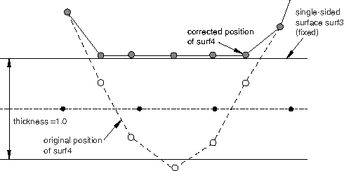 *CONTACT CLEARANCE, NAME=c2, ADJUST=YES, SEARCH BELOW=1.5, SEARCH ABOVE=0.0 ... *CONTACT *CONTACT CLEARANCE ASSIGNMENT surf3, surf4, c2If the nodes of surf3 are not fixed, the clearance interaction can be set to pure master-slave (with surf3 defined as the master) to prevent the geometry of surf3 from being modified.