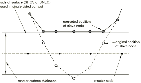Because of the lack of a unique outward direction from double-sided facets, the resolution of large initial penetrations for double-sided surfaces can be difficult. Initial penetration will be detected only when a slave node lies within the thickness of the underlying element, and the initial penetration will be resolved by moving the slave node to the nearest free surface as shown in Figure 36.5.4–1.
