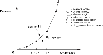 An alternative piecewise linear tabular pressure-overclosure relationship can be constructed by geometrically scaling the default contact stiffness. This model provides a simple interface to increase the default contact stiffness when a critical penetration is exceeded. A penetration measure,