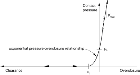 In an exponential (soft) contact pressure-overclosure relationship the surfaces begin to transmit contact pressure once the clearance between them, measured in the contact (normal) direction, reduces to