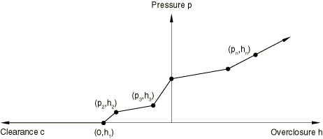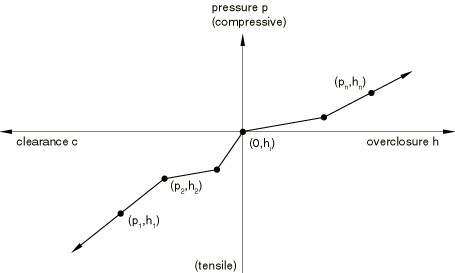 ) of pressure versus overclosure (where overclosure corresponds to negative clearance). You must specify the data as an increasing function of pressure and overclosure. In this relationship the surfaces transmit contact pressure when the overclosure between them, measured in the contact (normal) direction, is greater than