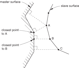 The slave nodes are constrained not to penetrate into the master surface; however, the nodes of the master surface can, in principle, penetrate into the slave surface (for example, see the case on the upper-right of Figure 38.1.1–2).