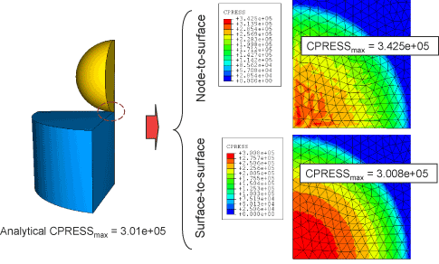 In general, surface-to-surface discretization provides more accurate stress and pressure results than node-to-surface discretization if the surface geometry is reasonably well represented by the contact surfaces. Figure 38.1.1–3 shows an example of improved contact pressure accuracy with surface-to-surface contact compared to node-to-surface contact.