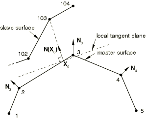 is the contact direction for slave node 103 and defines the orientation of the local tangent plane. In this example, as in many cases, the local tangent plane is only an approximation of the actual mesh geometry.